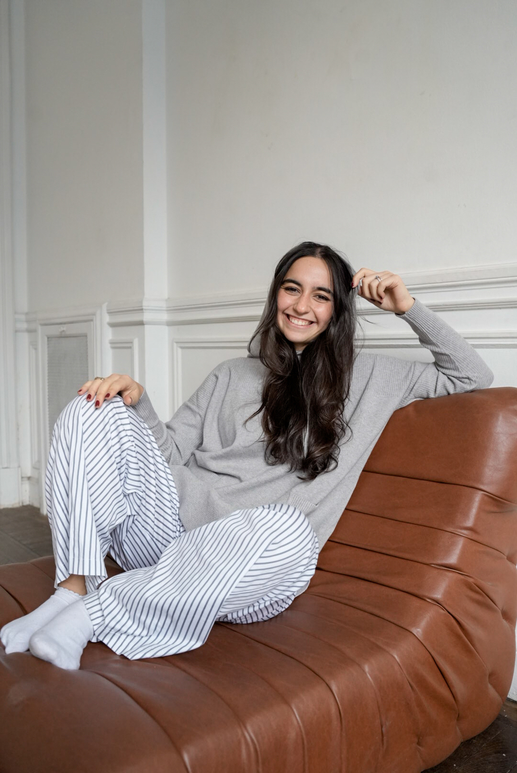 La modelo lo usa con nuestra camisa de tencel denim Lirio Azul